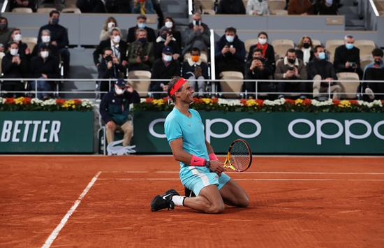 2020年10月11日,在法国巴黎进行的2020年法国网球公开赛男单决赛中,西班牙选手纳达尔以3比0战胜塞尔维亚选手焦科维奇,夺得冠军。(图片来源:新华社)