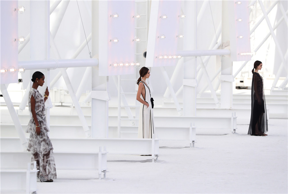 2020年10月6日,在法国巴黎大皇宫,模特展示香奈儿2021春夏新品成衣。(图片来源:新华社)