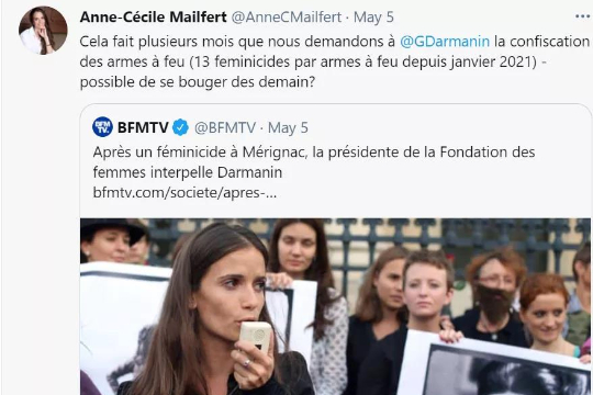 女性基金会主席马尔菲(Anne-Cécile Mailfert)一直致力于要求政府立法立即没收被起诉家暴者枪支。事发后,她在社交网站上愤怒写道:“凶手不仅是个累犯,还拥枪自重!再一次!”