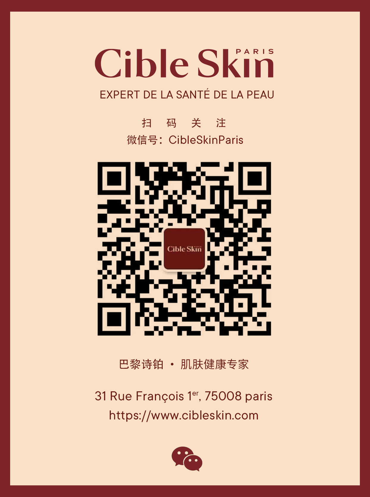 31rue du François1er不仅仅是一个医学护肤中心,是健康肌肤之家,更是Cible Skin医学护肤品的发源地。在这里,Cible Skin不断探索、创新,为您带来肌肤专属的沉浸式体验。