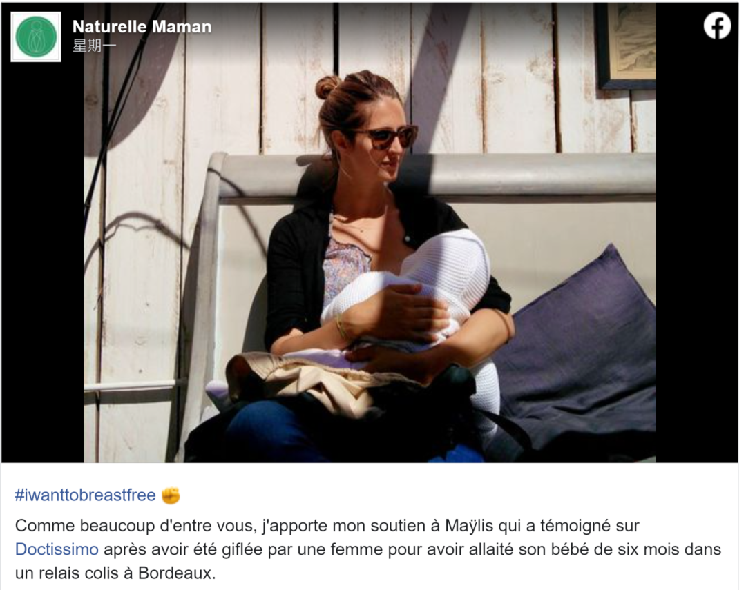 一周前,在法国波尔多,Maÿlis因在公共场所给6个月大的孩子喂奶,遭身边一名女子扇耳光。此事在社交网上引起轩然大波。大批网友晒出自己给孩子喂奶的照片来声援这位年轻妈妈。