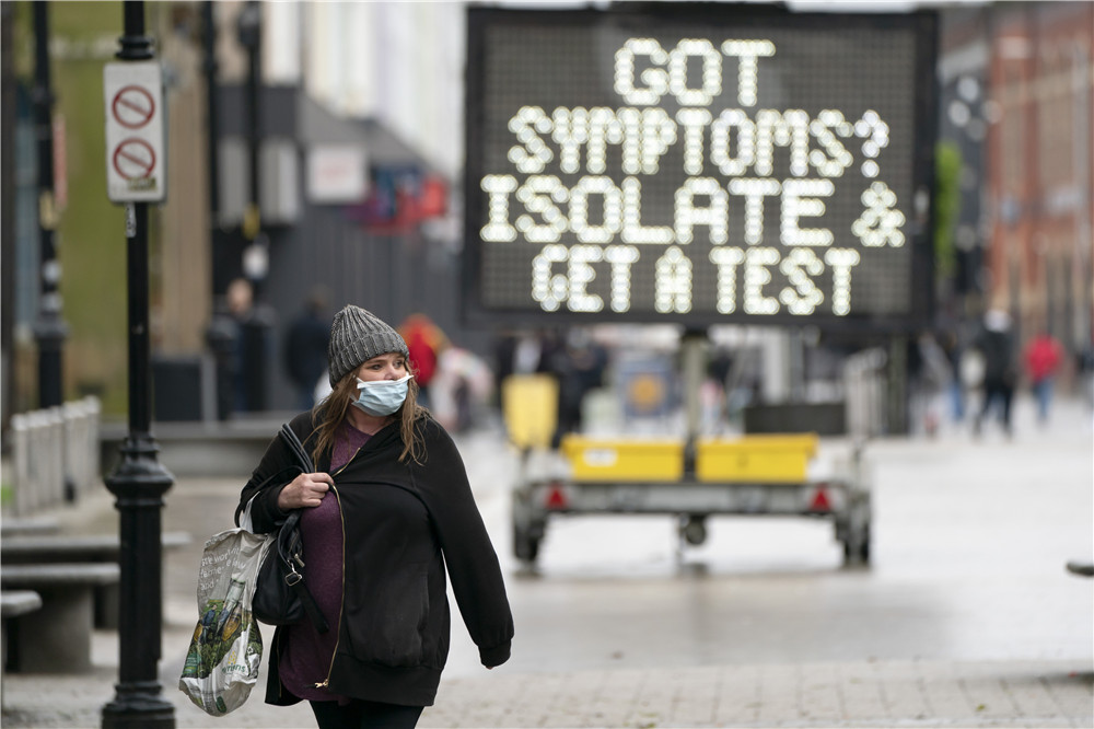 5月21日,一名女子走过英国英格兰北部博尔顿一处显示“出现症状应隔离并检测”字样的显示屏。(图片来源:新华社)