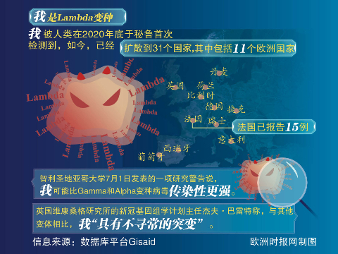 根据法国公共卫生局于6月30日发布的新冠病毒最新风险分析报告,Lambda变种已经蔓延至欧洲,在包括法国、英国、德国在内的9个国家都发现了这种病毒的踪迹。