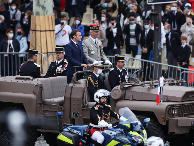 7月14日,法国总统马克龙在巴黎协和广场国庆阅兵式现场检阅队伍。(图片来源:本文图片均据新华社)