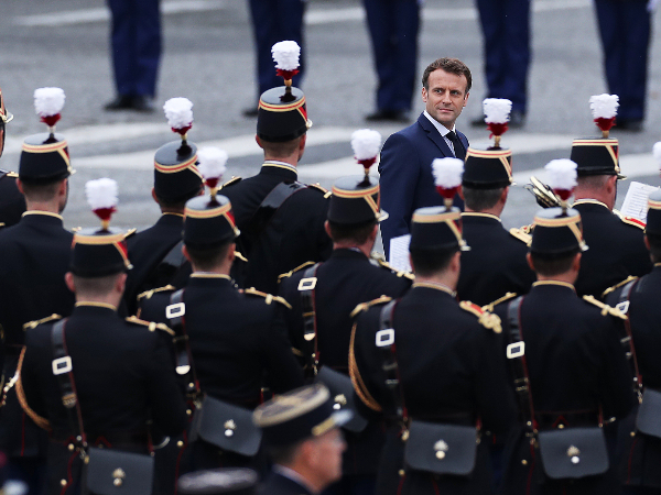法国总统马克龙在巴黎协和广场国庆阅兵式现场检阅队伍。