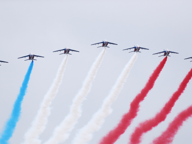 在国庆阅兵式现场拍摄的“法兰西巡逻兵”飞行表演队。