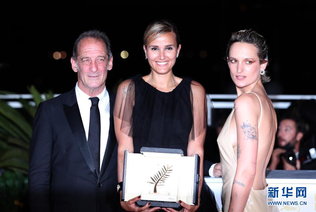 影片《钛》的导演朱利娅·迪库尔诺(中)、演员文森特·林顿(左)和阿加特·鲁塞尔出席拍照式。《钛》获得最高奖最佳影片金棕榈奖。(图片来源:本文图片均自新华网)