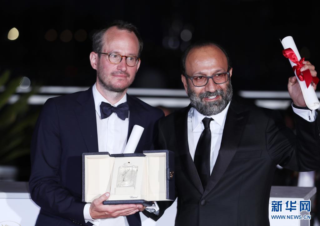 伊朗影片《一个英雄》的导演阿斯哈·法哈蒂(右)和芬兰影片《六号车厢》的导演尤霍·库奥斯马宁出席拍照式。《一个英雄》和《六号车厢》并列获得本届电影节评审团大奖。
