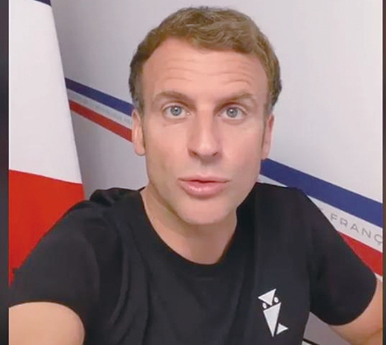 8月2日,正在布雷冈松堡度假的法国马克龙总统通过Instagram和Tik Tok发布了一分钟的自拍短视频。他意气洋洋穿着一身黑体恤,坐在法国国旗前面,说自己愿意直接回答民众提出的有关新冠疫苗的问题,以消除流行的各种假信息。(图片来源:TikTok截图)