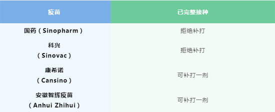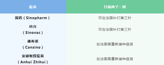 这张表格里一共列举了4款中国的疫苗,对于只在国内完成了一剂接种的人群,法国对于补打的建议如下: