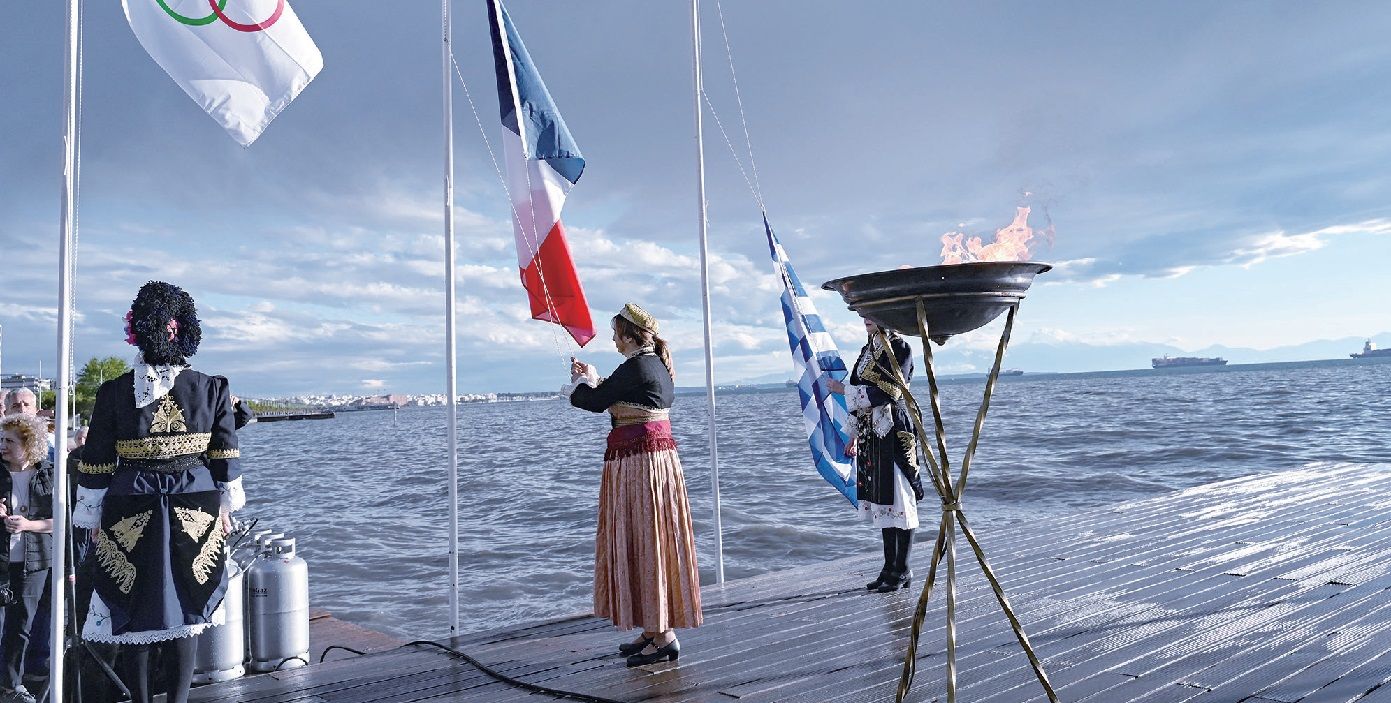 4月21日,奥林匹克圣火传递到希腊的塞萨洛尼基(Thessaloniki)。图为身着传统服装的礼宾人员依次升起奥运五环旗、法国国旗和希腊国旗。法新社图