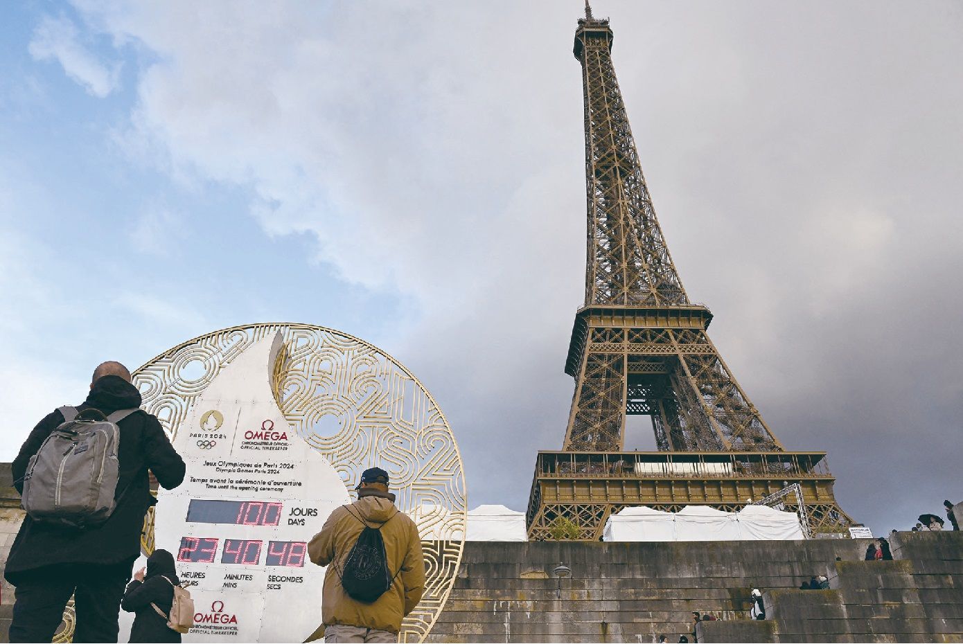 巴黎奥运气氛日渐浓厚,这是4月17日埃菲尔铁塔附近的奥运会倒计时电子计时器显示距离奥运会开幕还有100天。法新社图