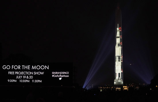 图为7月16日晚,在美国华盛顿,“土星5号”火箭的影像被投射到华盛顿纪念碑上。(图片来源:新华社)