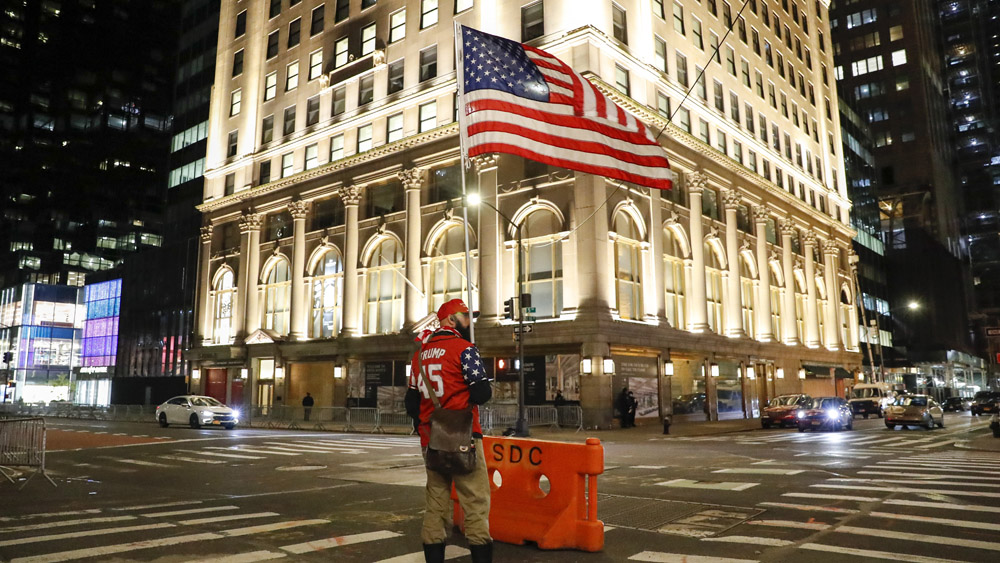 图为一名特朗普支持者在曼哈顿街头。(图片来源:中新社)