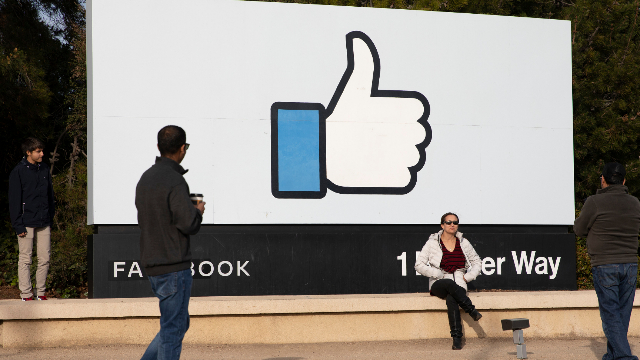 图为游客在位于美国加州门洛帕克的脸书总部留影。(图片来源:中新社)