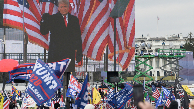 图为1月6日上午白宫外的示威者通过大屏幕观看特朗普发表讲话。(图片来源:中新社)