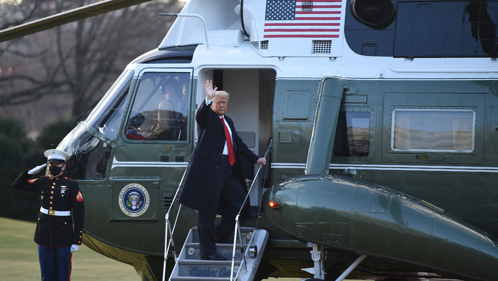 当地时间1月20日上午8时15分许,即将卸任的美国第45任总统特朗普离开白宫。图为特朗普当天在登上直升机后挥手致意。(图片来源:中新社)