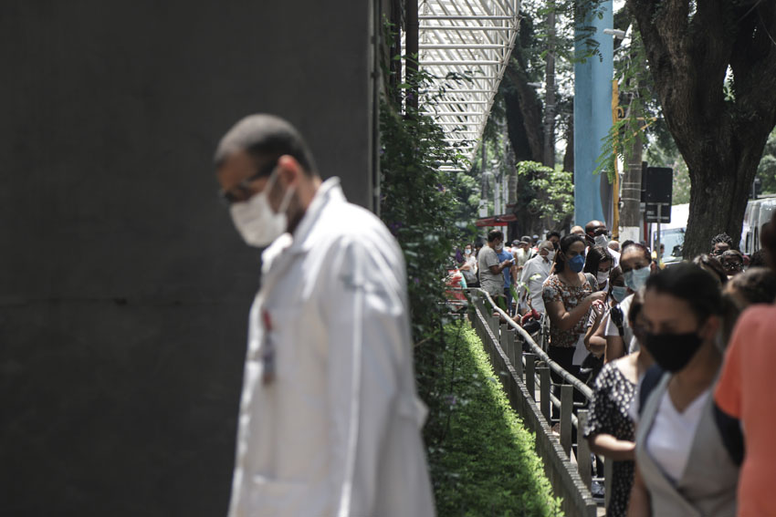 巴西圣保罗医务人员排队等待接种新冠疫苗。(图片来源:新华社)