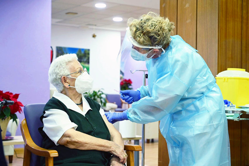 2020年12月27日,西班牙瓜达拉哈拉的洛斯奥尔莫斯养老院的96岁阿拉塞莉·伊达尔戈(左)接受新冠疫苗注射。(图片来源:新华社)