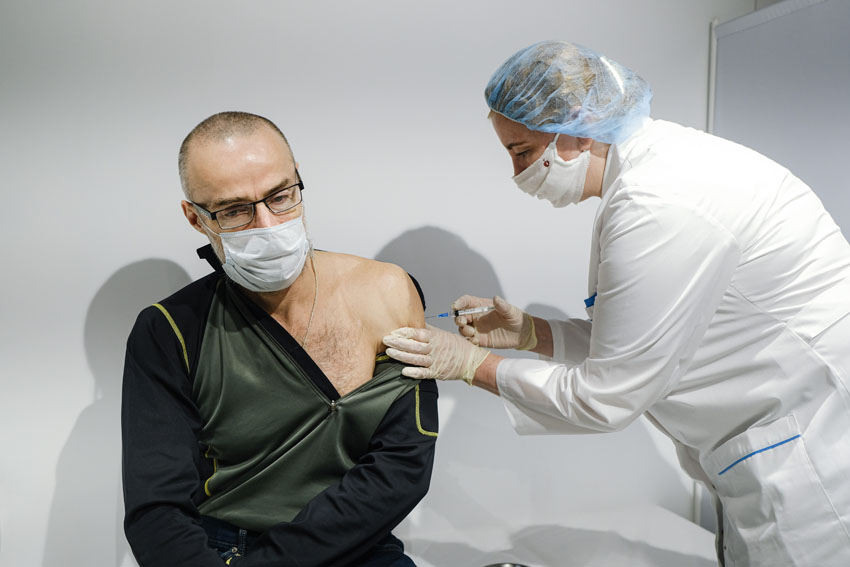 俄罗斯一名男子接种新冠疫苗。(图片来源:新华社)
