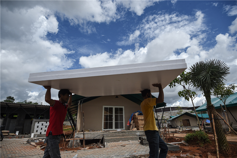 图为工作人员在印度尼西亚为新冠病人建造临时隔离病房。(图片来源:新华社)