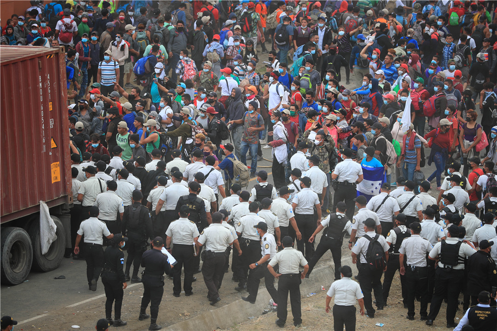 1月18日,在危地马拉奇基穆拉省靠近洪都拉斯的边境小镇巴多翁多,危地马拉安全部队试图驱散和阻拦中美洲移民。(图片来源:新华社)