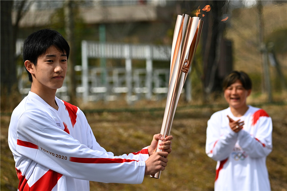3月25日,第二棒火炬手大和田朝斗手持火炬。(图片来源:新华社)