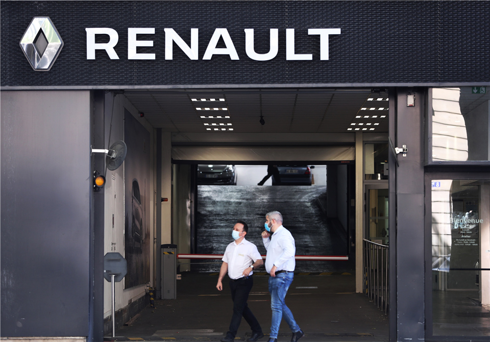 2020年5月29日,法国汽车制造商雷诺集团发布公报说,受新冠疫情影响,汽车行业遭遇重大挑战,集团计划采取多项措施加速转型以渡过难关。图为在法国巴黎,人们走出一家雷诺专卖店。(图片来源:新华社)