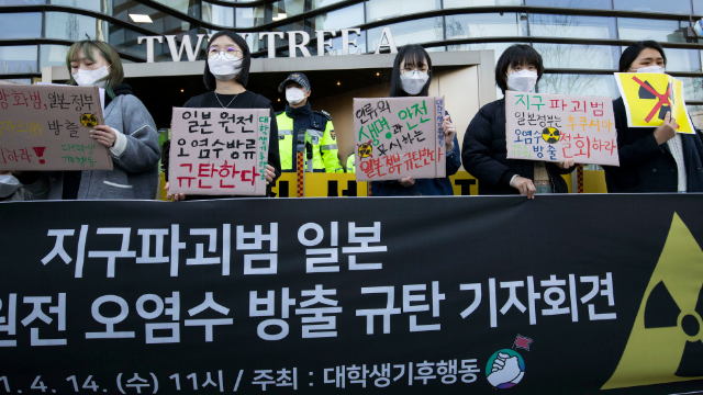 4月14日,韩国民众在位于首尔的日本驻韩国大使馆外集会,抗议日本政府将福岛核废水排入大海。(图片来源:新华社)
