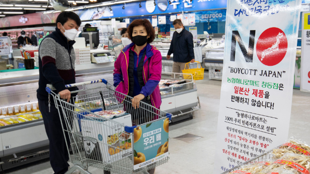 4月14日,韩国首尔的一家农协连锁超市的水产商品货架前打出“抵制日本”、“本店不销售日本产产品”等标语,对日本政府决定将福岛第一核电站核废水排入大海表示抗议。(图片来源:新华社)