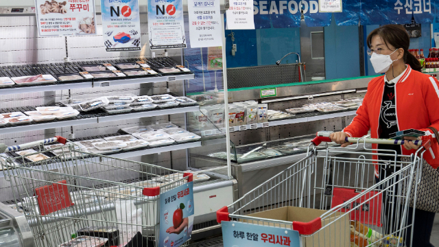 韩国首尔的一家农协连锁超市的水产商品货架前打出“抵制日本”、“本店不销售日本产产品”等标语,对日本政府决定将福岛第一核电站核废水排入大海表示抗议。(图片来源:新华社)