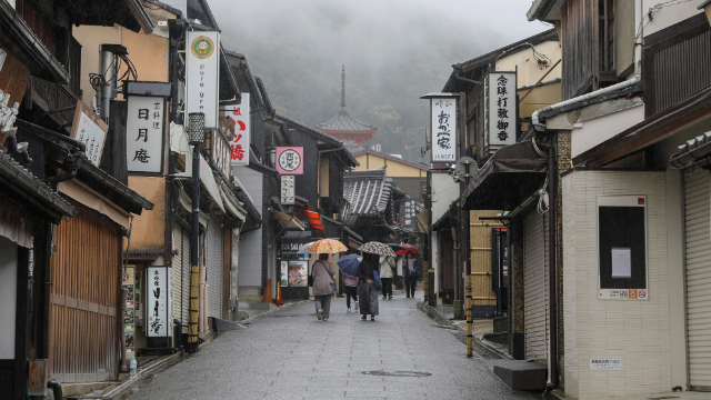 在日本京都,清水寺附近的商业街上游人稀少,店铺暂停营业。(图片来源:新华社)