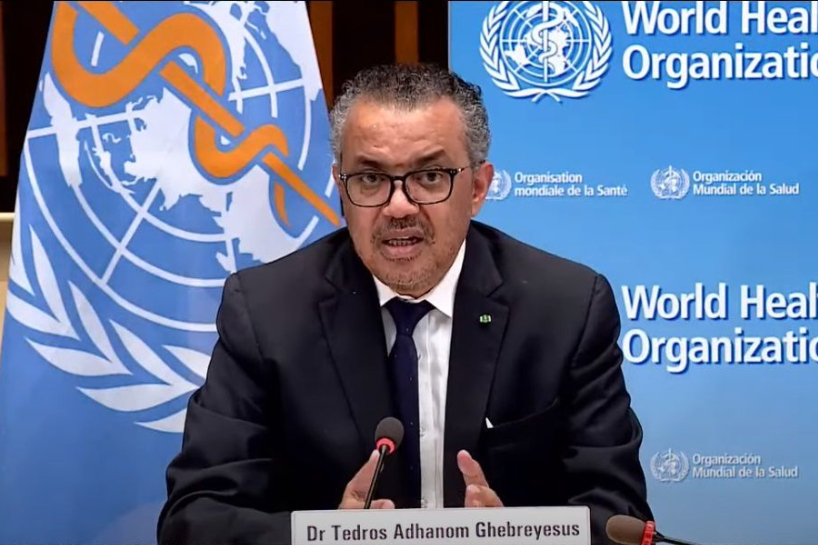 谭德塞5月7日在瑞士日内瓦出席新闻发布会的视频截图。(图片来源:新华社)