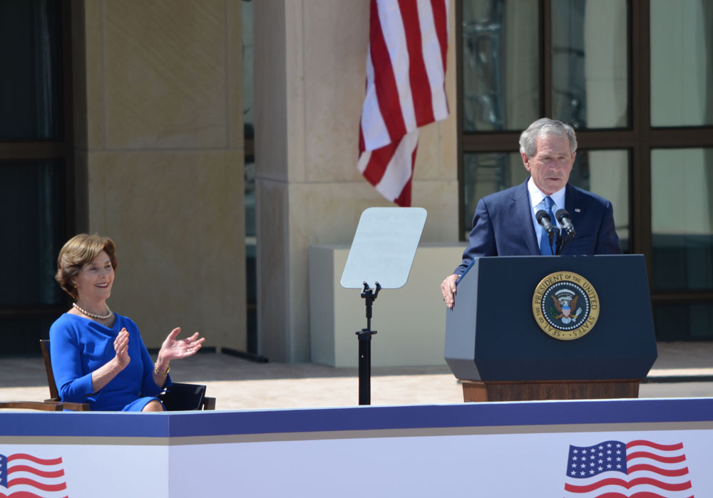 2013年4月25日,美国前总统小布什出席小布什图书馆落成典礼 。(图片来源:中新社)