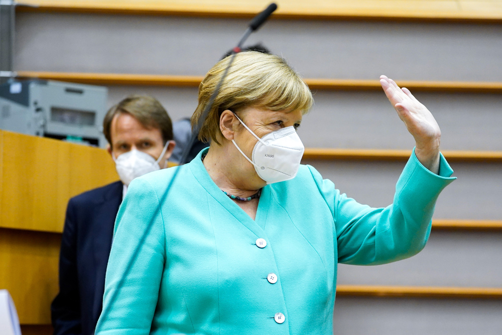 2020年7月8日,德国总理默克尔在比利时布鲁塞尔准备出席欧洲议会全会。(图片来源:新华社)