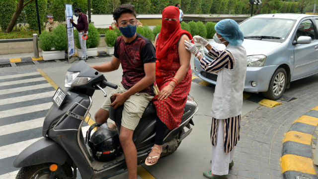 在印度诺伊达的一个“免下车”新冠疫苗接种点,医务人员为一名女子接种疫苗。(图片来源:新华社)