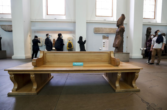 大英博物馆的座椅上放置着提醒参观者保持安全距离的提示牌。