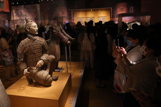 5月18日,“万年永宝—中国馆藏文物保护成果展”在位于北京的首都博物馆开展。图为秦始皇帝陵出土彩绘兵马俑吸引参观者。(图片来源:中新社)