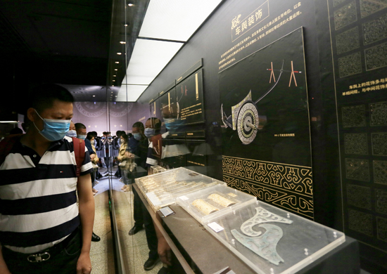 5月18日,兰州民众在甘肃省博物馆参观马家塬出土的车马饰、车马器。当天,“四牡业业——马家塬出土战国马车特展”在甘肃省博物馆开展,此次展览是甘肃省首次大规模正式考古发掘的战国西戎墓地。(图片来源:中新社)