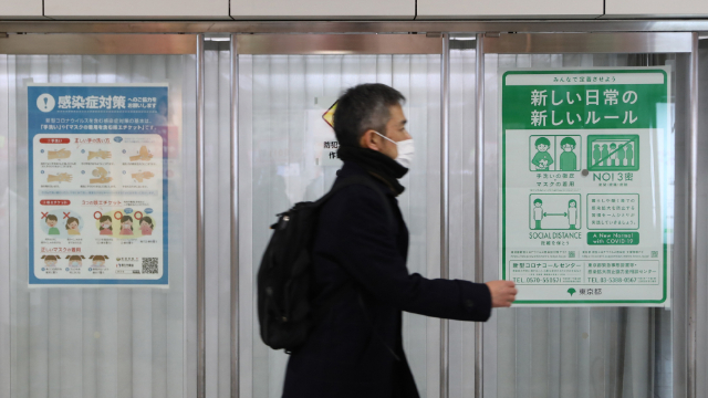 日本东京的一名行人戴口罩经过防疫信息海报。(图片来源:新华社)
