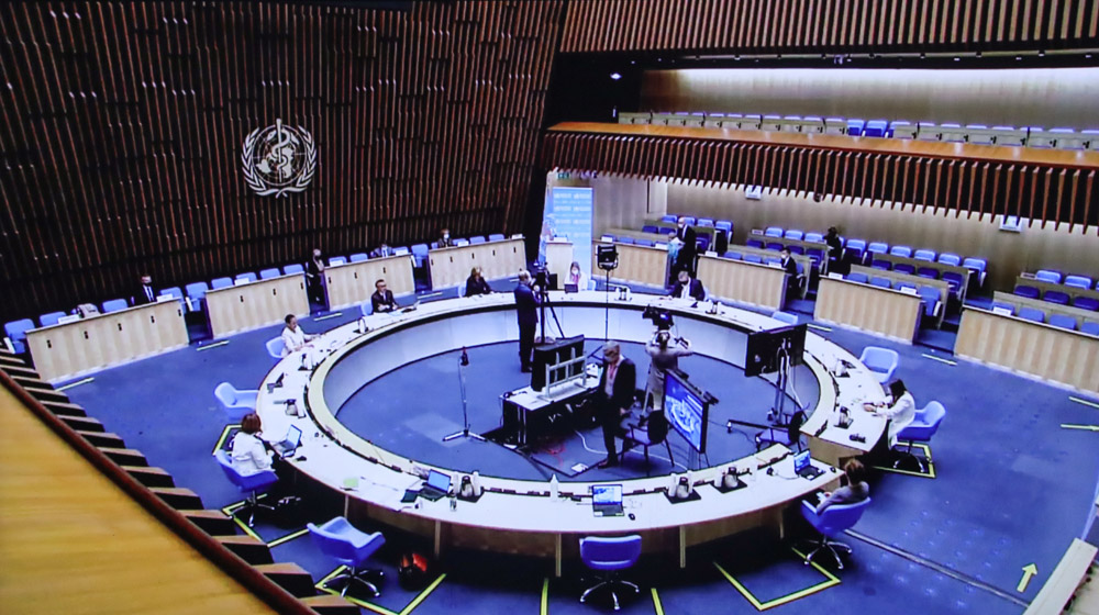 第74届世界卫生大会5月24日开幕。图为位于瑞士日内瓦的世界卫生组织总部会议现场视频画面。(图片来源:新华社)
