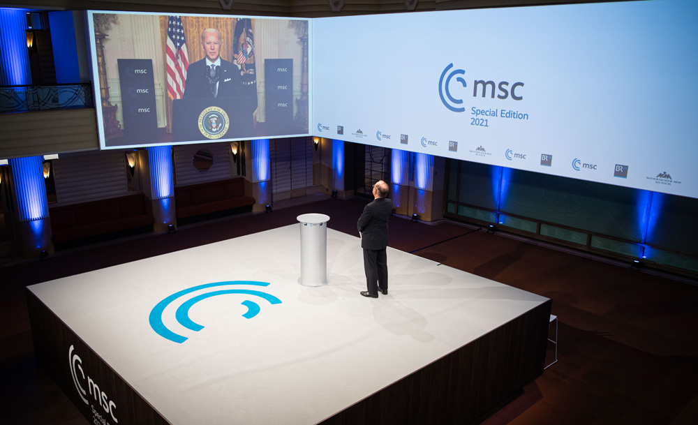 2月19日,美国总统拜登以视频形式出席慕尼黑安全会议时向大西洋对岸的欧洲盟友表示“美国回来了”。(图片来源:中新社)