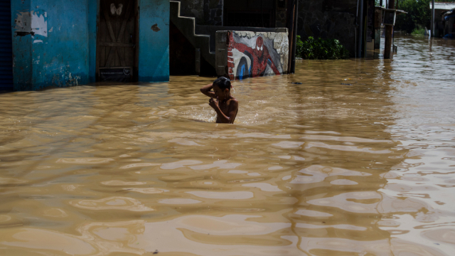 5月25日,一名男孩在印度尼西亚西爪哇省万隆被洪水浸泡的街道上玩耍。(图片来源:新华社)