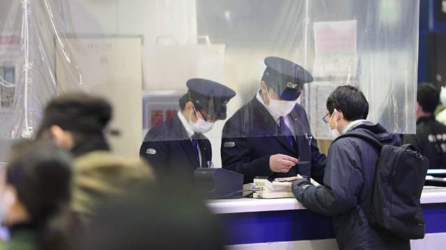 日本东京新宿车站的工作人员戴口罩为乘客服务的资料照片。(图片来源:新华社)