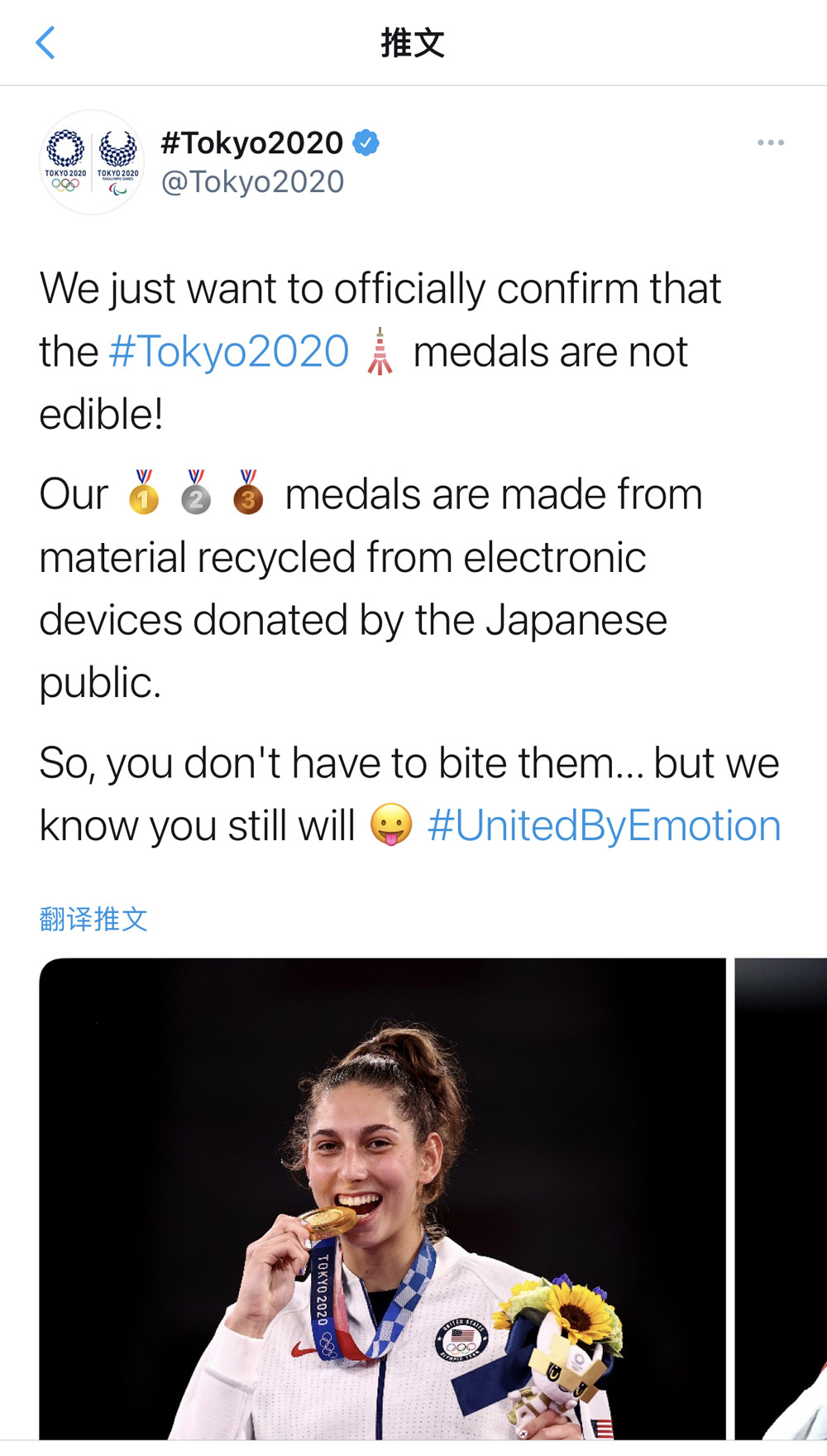 东京奥组委在推特上发文“提示”,奥运奖牌“不能吃”。(图片来源:推特截图)
