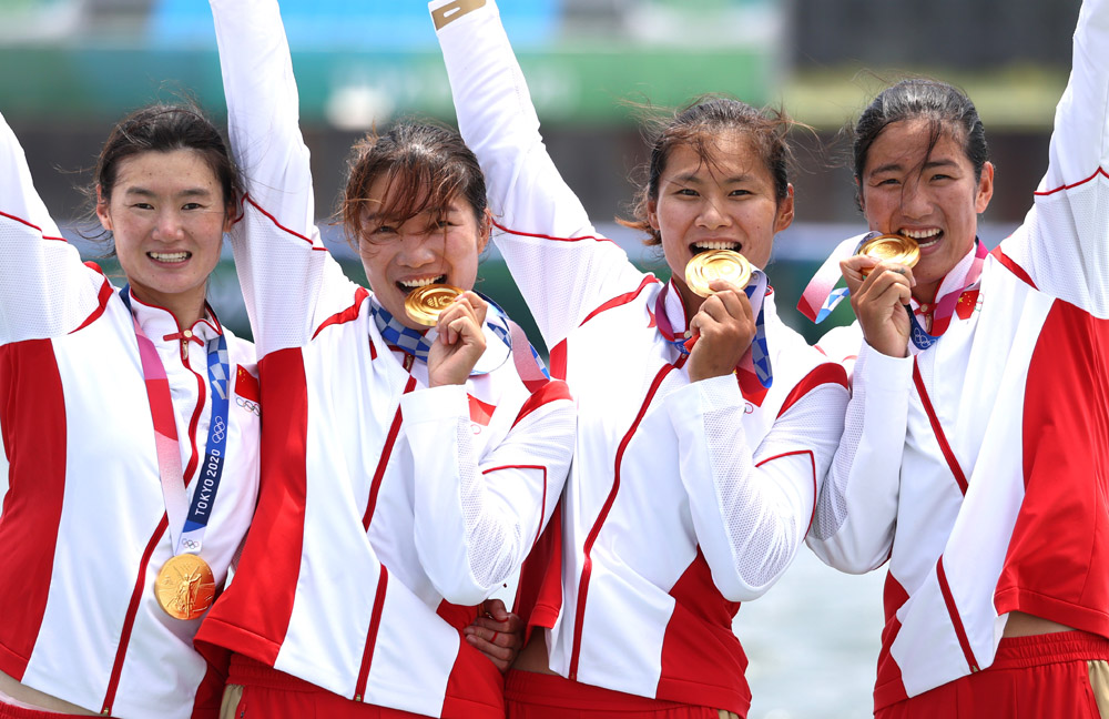 7月28日,东京奥运会赛艇项目女子四人双桨决赛中,中国队夺得冠军。(图片来源:新华社)