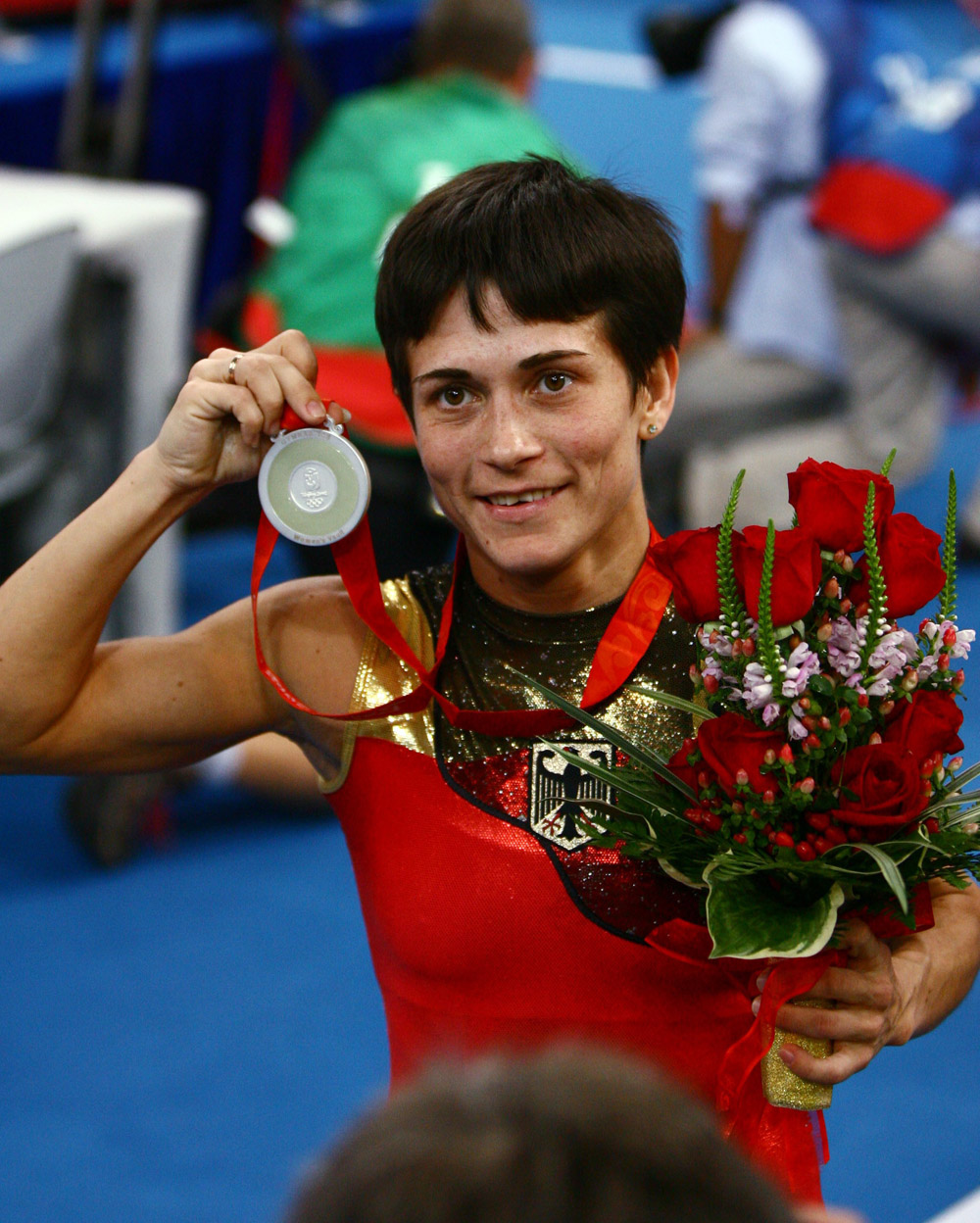 2008年8月17日,体操运动员丘索维金娜在北京奥运会女子跳马颁奖仪式后展示奖牌。(图片来源:新华社)