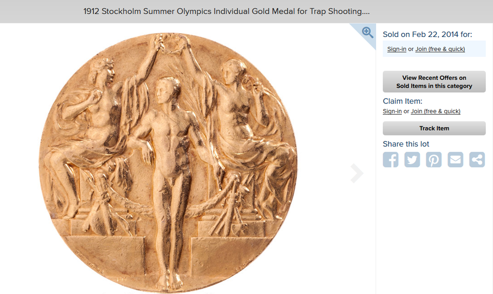 图为1912年第五届瑞典斯德哥尔摩奥运会推出的纯金金牌。(图片来源:海瑞得拍卖行官网截图)
