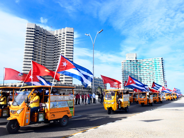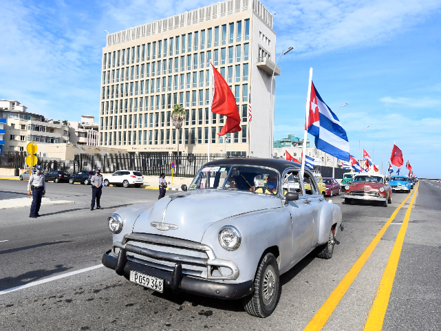 在古巴首都哈瓦那,参加游行的车辆从美国驻古巴大使馆前驶过。(图片来源:本文图片均据新华社)