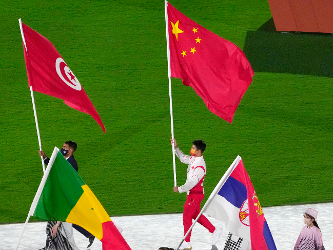 中国代表团旗手苏炳添高举五星红旗进入体育场。